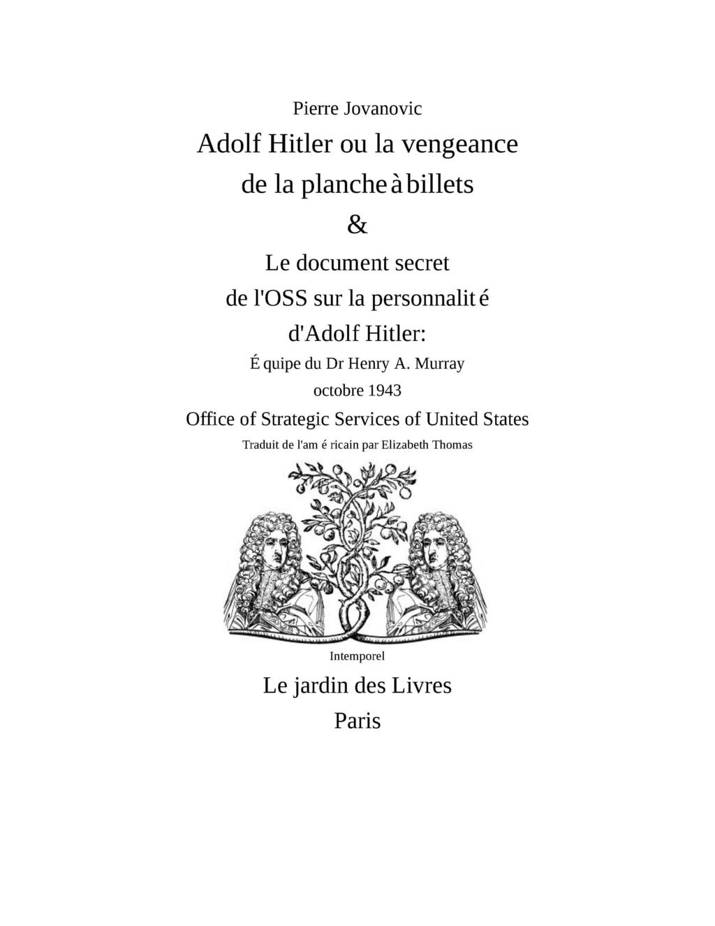 Dans ce livre, Pierre Jovanovic aborde un sujet plus tabou encore que la planche à billets grâce un rapport unique de l’OSS (devenue CIA) jamais publié en français, sur la personnalité unique hors normes de celui qui allait mettre l’ Europe à feu et à sang et déclencher l’Holocauste en entendant “des voix”.