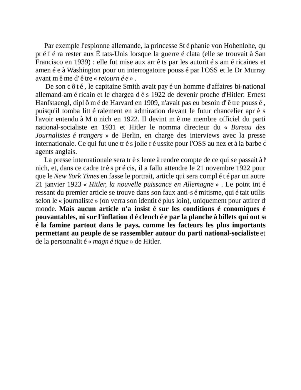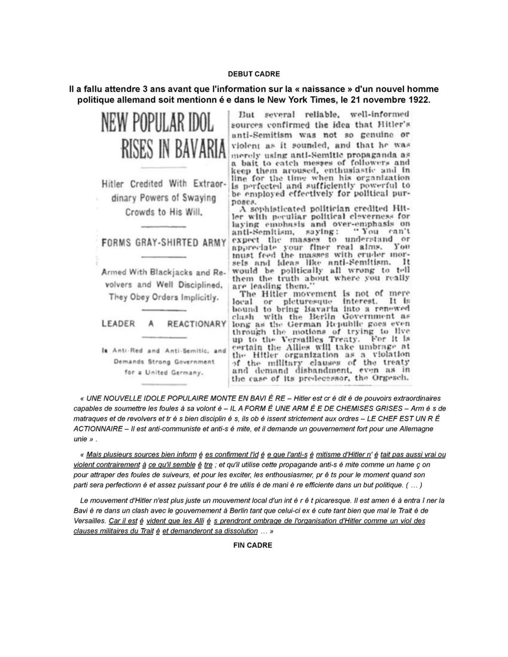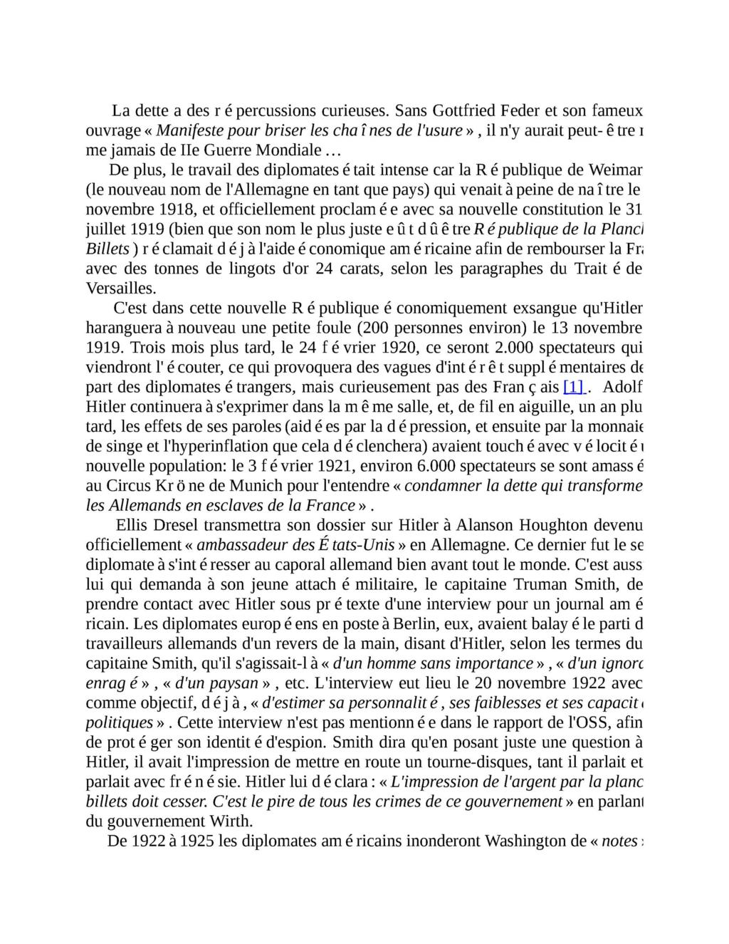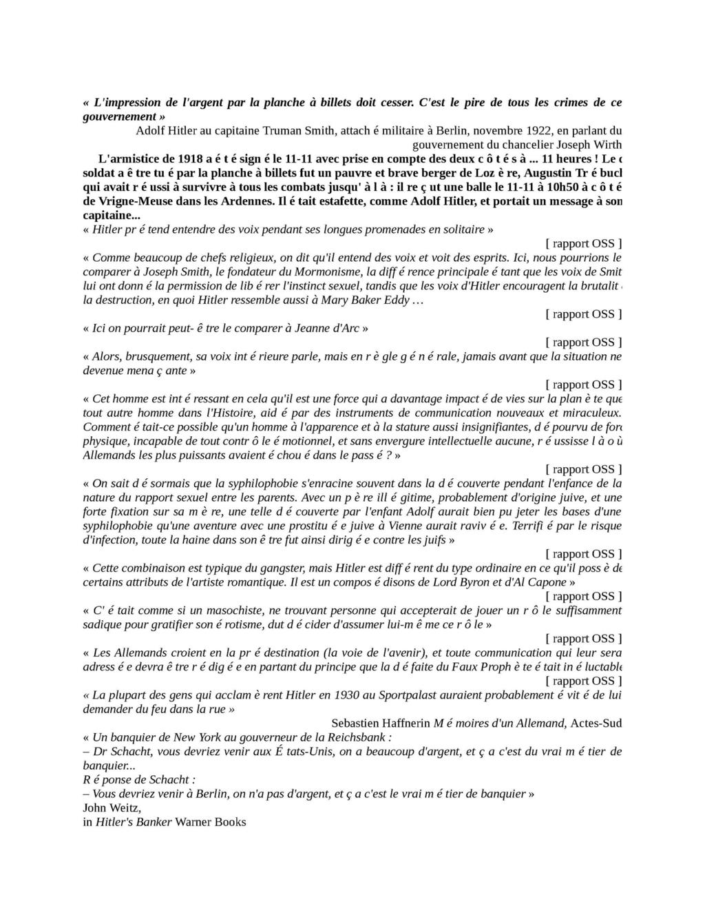 Et c’est précisément l’usage massif de cette fausse monnaie dès 1914 qui a crée Hitler de toutes pièces le 11 novembre, le “Destin” ou “La Providence” se chargeant ensuite de le protéger, en lui permettant d’échapper grâce à “sa voix intérieure” à des balles, à des obus, à des bombes, au total à plus de 40 tentatives d’assassinat et cela pendant 27 ans !