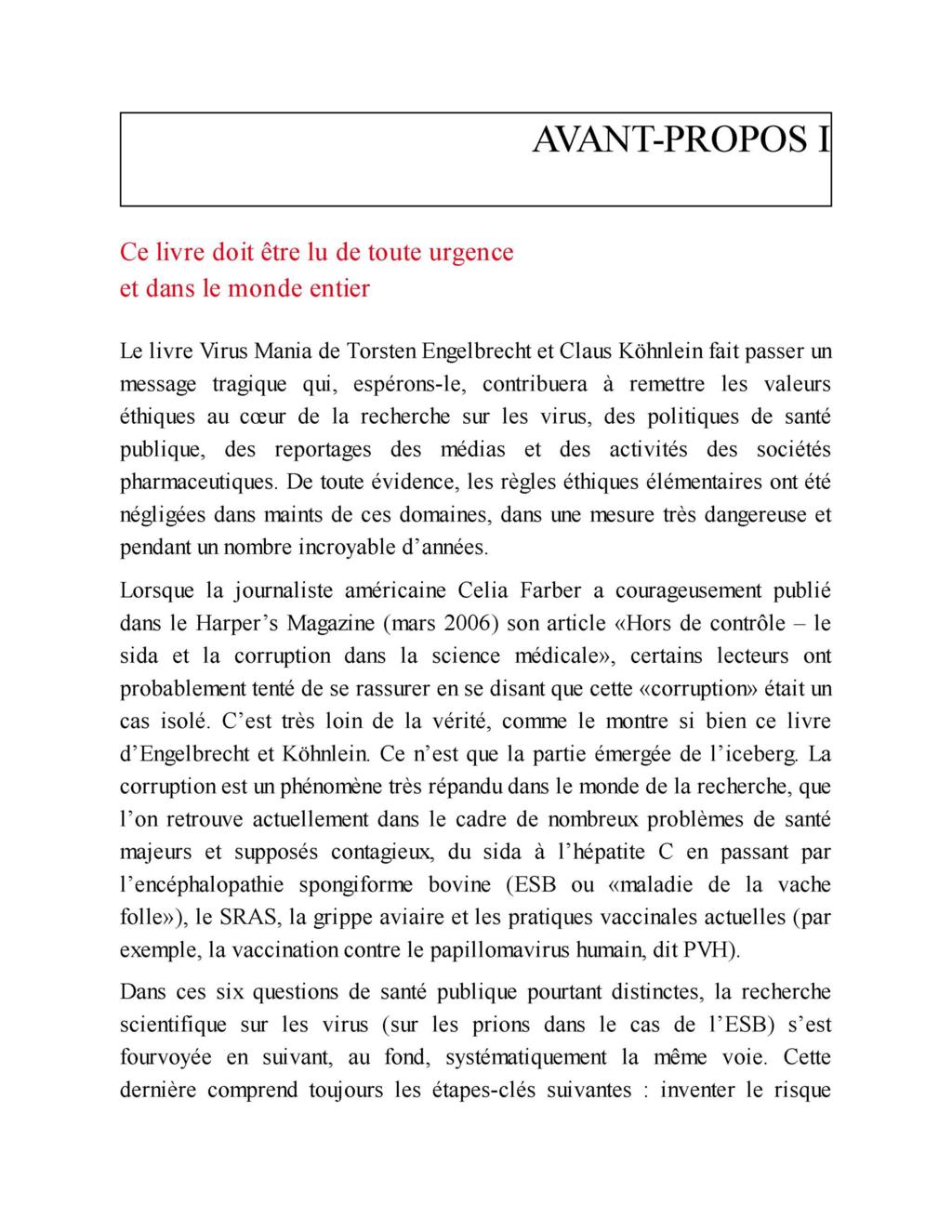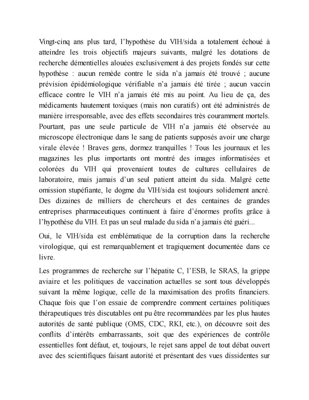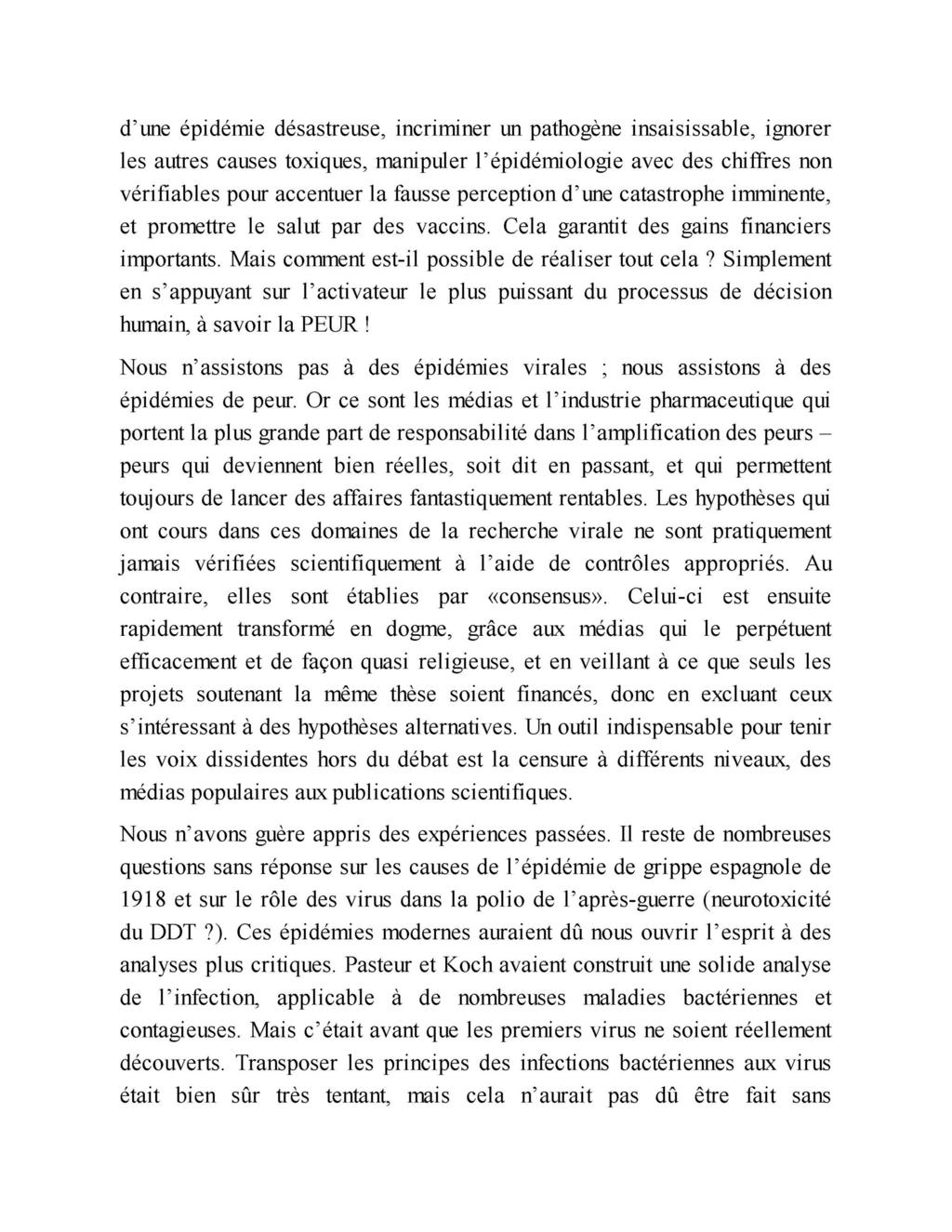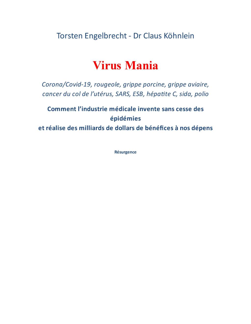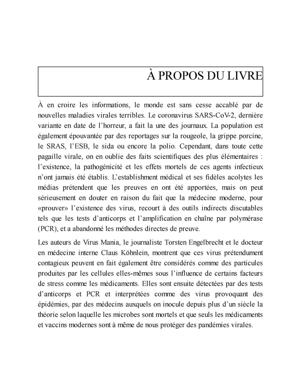 « Ce livre, Virus Mania, peut être considéré comme le premier ouvrage dans lequel les erreurs, les fraudes et les désinformations générales propagées par les avis officiels au sujet des infections douteuses ou non virales, sont exposées de manière très complète. »